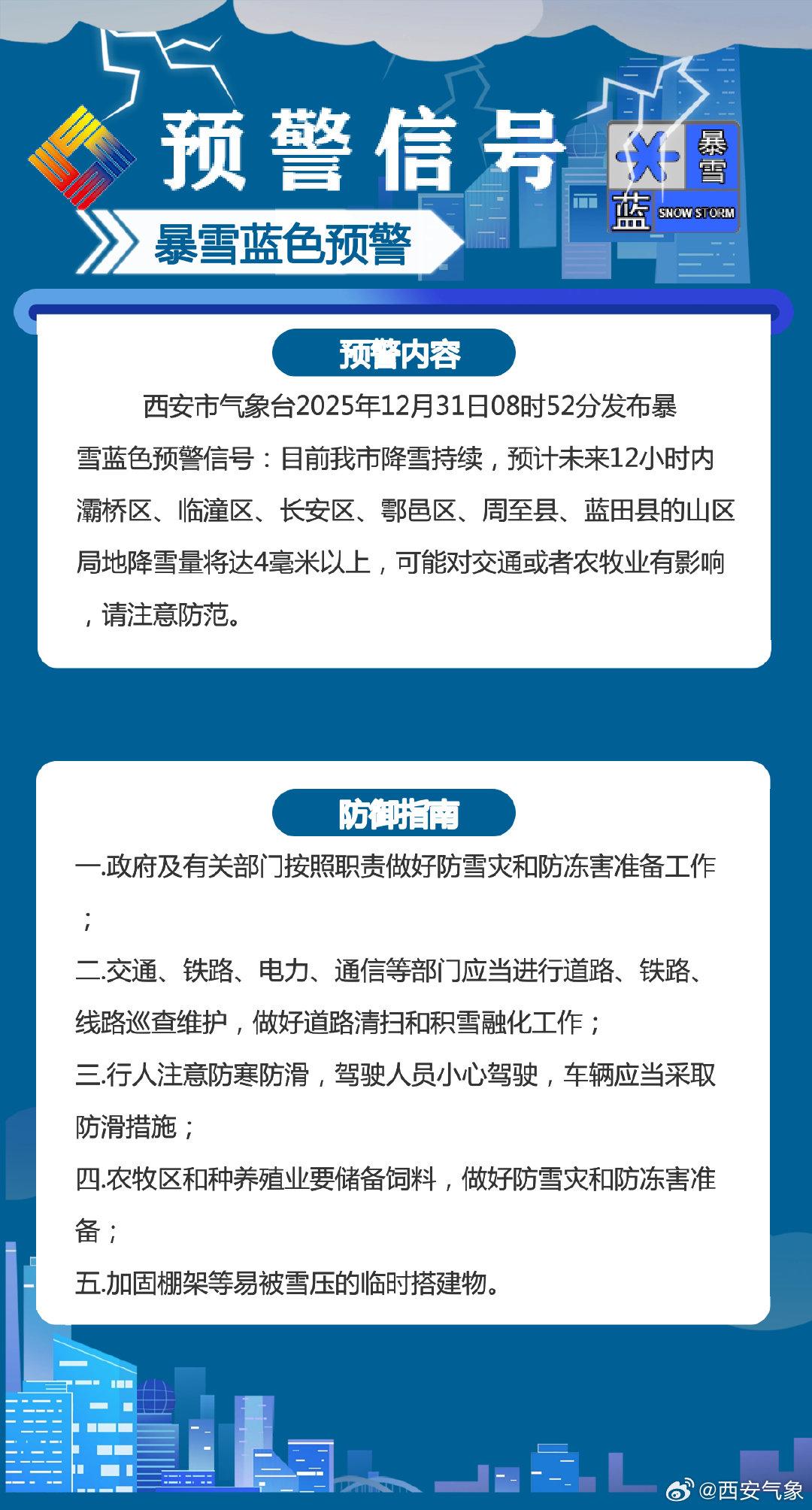 西安市气象台2025年12月31日08时52分发布暴雪蓝色预警信号: