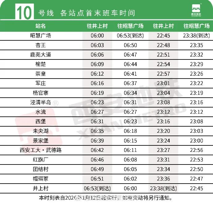 结合近期线网客流变化,为进一步满足市民乘客出行需求,西安地铁将于2026年1月12日(周一)起,对2、10、15号线末班车时间进行调整。