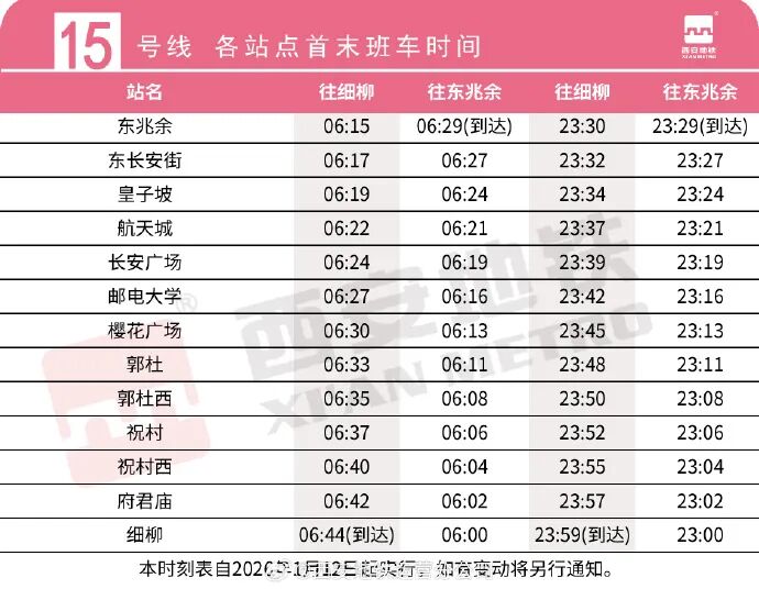 15号线东兆余站末班车发车时间延长至 23:30、细柳站末班车发车时间延长至 23:00。