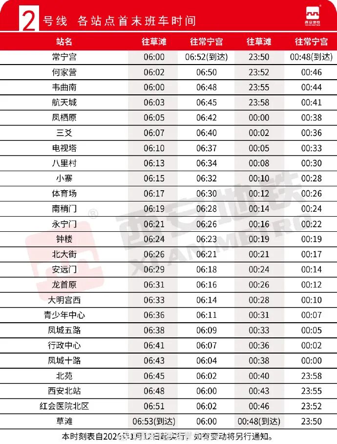 其中,2号线草滩站、常宁宫站末班车发车时间延长至23:50;