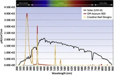 太阳(黑线)和美甲灯(黄线)的光谱发射比较