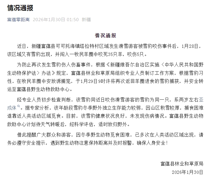 1月30日,新疆富蕴县林业和草原局发布情况通报: