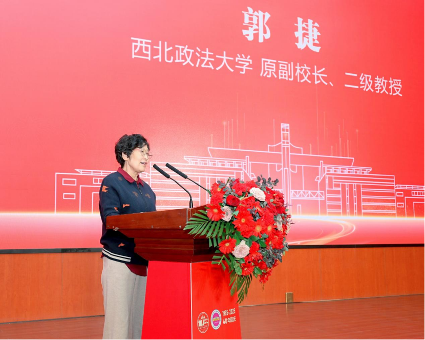 教师代表、西北政法大学原副校长郭捷教授深情回顾了学院奠基创业、创新育人、转型改制三个发展阶段,勉励学院要以习近平法治思想为指引,不断深化教育教学改革,构建更加科学的本硕博多层次贯通制人才培养体系,培养卓越法治人才。