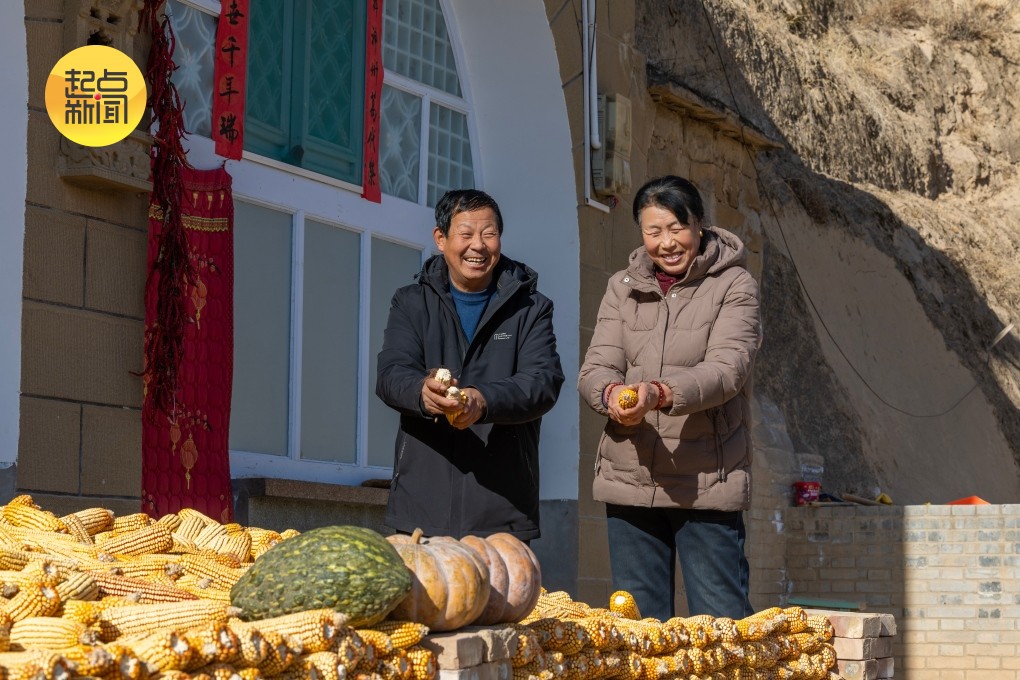 图为果农高乃柱和老伴儿在自家院子里掰玉米