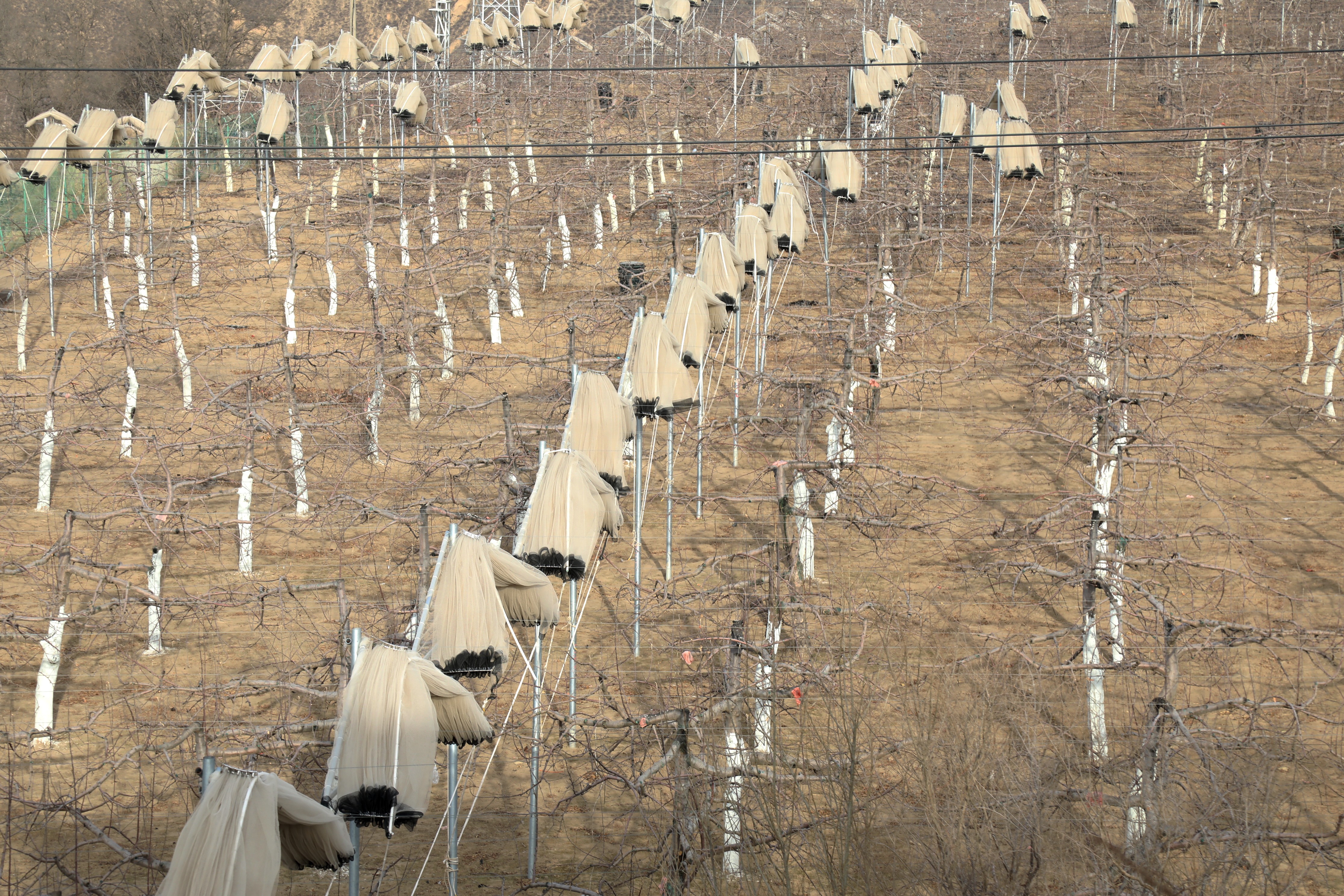 沿着村道向果园深处走去,连片的标准化苹果种植园映入眼帘。整齐划一的果树行距规整、树形优美,白色防雹网如银纱般覆盖枝头,地布与秸秆覆盖在树盘周围,软体集雨窖、水肥一体化设备错落分布。曾经零散粗放的坡地,如今变身“渠相通、路相连、旱能灌、涝能排”的高标准果园,成为黄土高原上一道亮眼的绿色风景线。