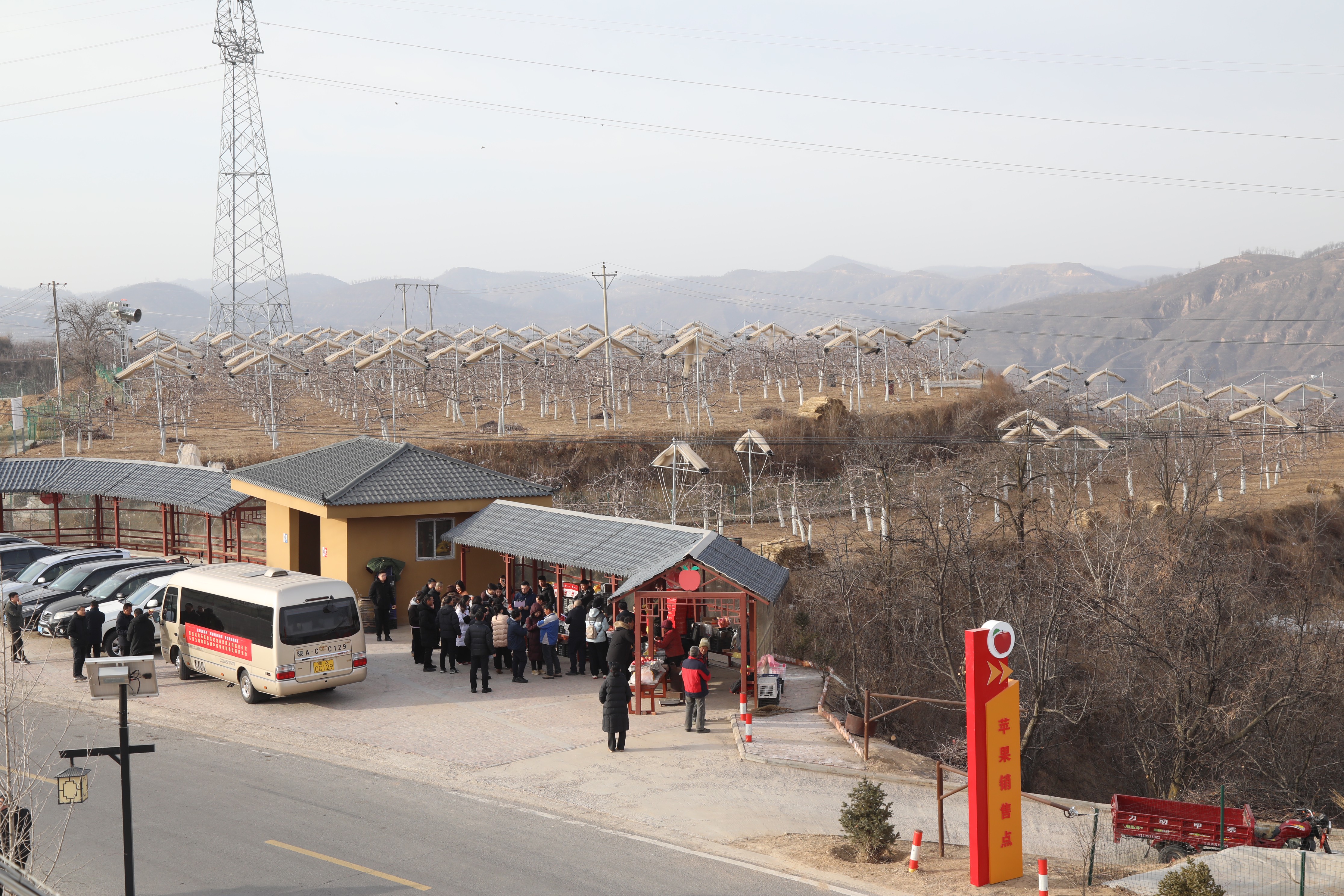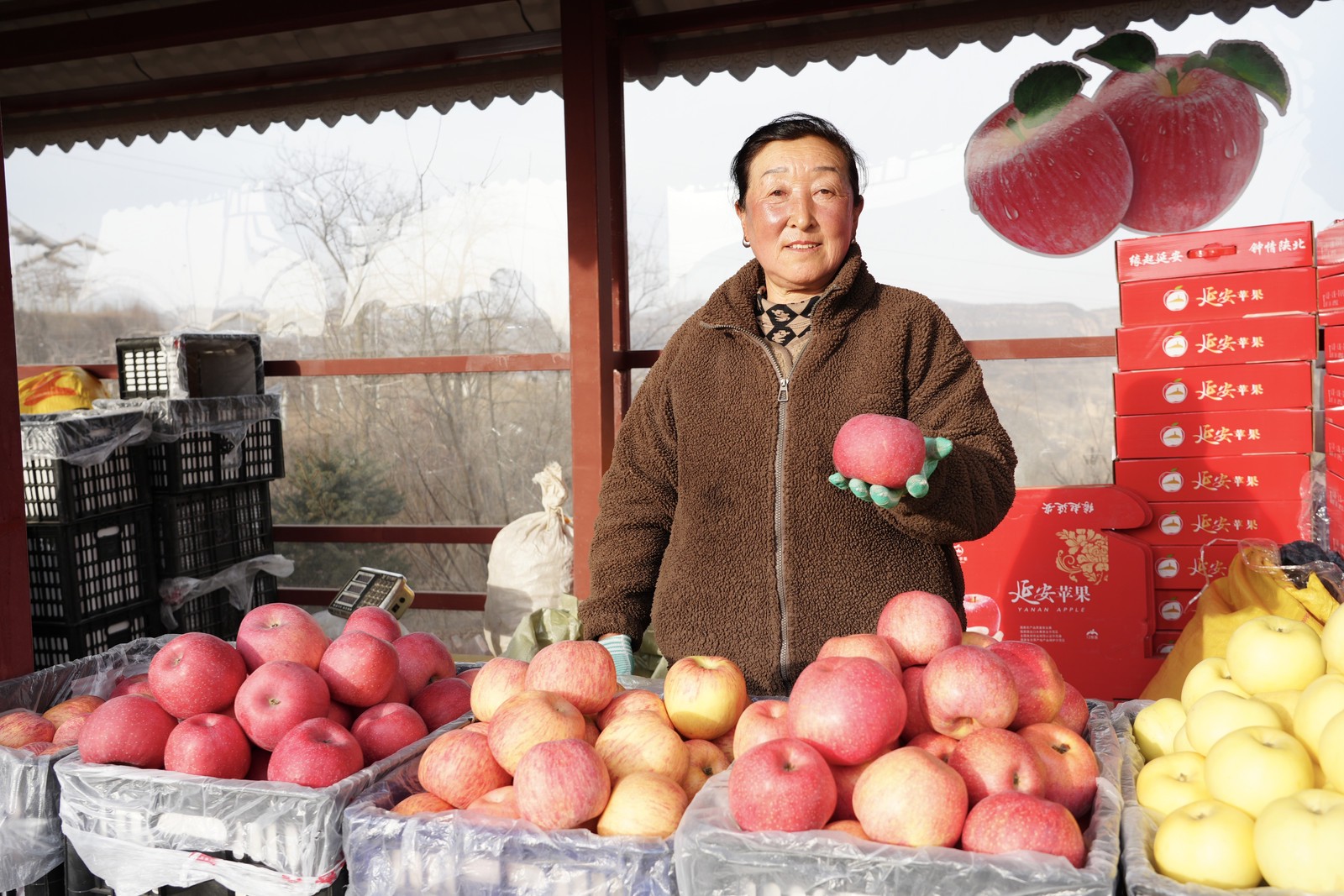村口设置的苹果销售点人声鼎沸,60元一盒的12枚富士苹果礼盒备受青睐,村民们的吆喝声与往来客商的询价声交织,绘就一幅红火的新春丰收图景。