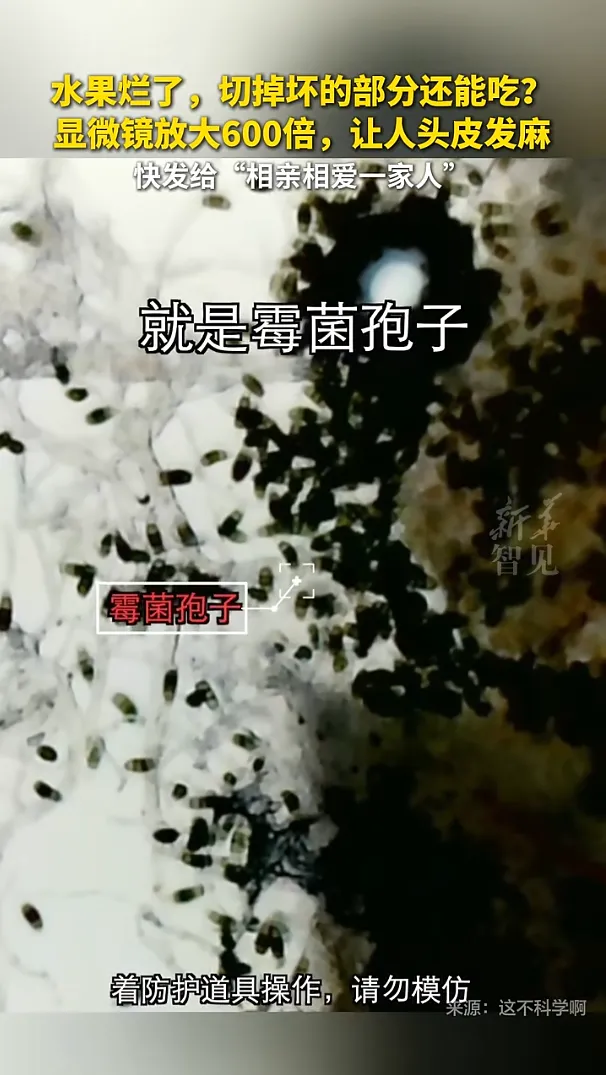 近期,一位短视频博主用显微镜把烂水果放大了600倍,结果看完让人头皮发麻:腐烂区域的果肉中布满了密密麻麻的霉菌孢子,周围还蔓延出大量菌丝。
