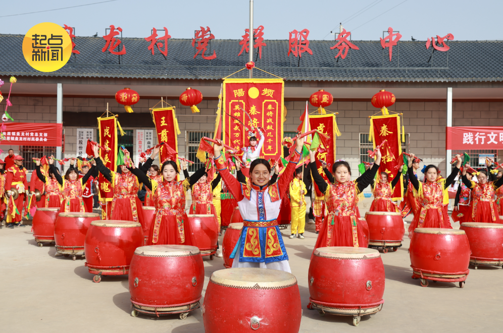 美原是历史上著名的频阳县所在地,是秦代名将王翦故里。上午11点整,在村的65岁以上老人们坐满圆桌。一场颇具特色的秦将王翦战鼓表演,拉开庆祝活动序幕。年轻女性居中,在统一指挥下奋力敲响战鼓,最前方的女孩更是全神贯注、英姿飒爽。激越的鼓声和变换的队形,与外围由中老年人敲打出的锣声、铙钹声密切配合,一起构成马年策马扬鞭的奋进强音。