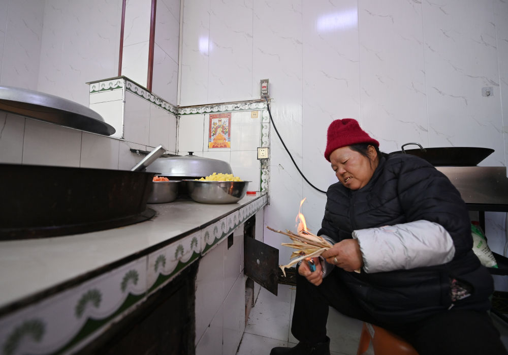 2月6日,庞富强的母亲唐水叶在厨房烧灶。新华社记者 李一博 摄