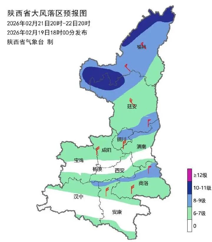 2月21日至22日全省大部有4~5级(5.5~10.7米/秒)偏北风,阵风6~7级(10.8~17.1米/秒),其中榆林部分和延安北部阵风可达8~9级(17.2~24.4m/s)、局地10级(24.5~28.4m/s)以上。