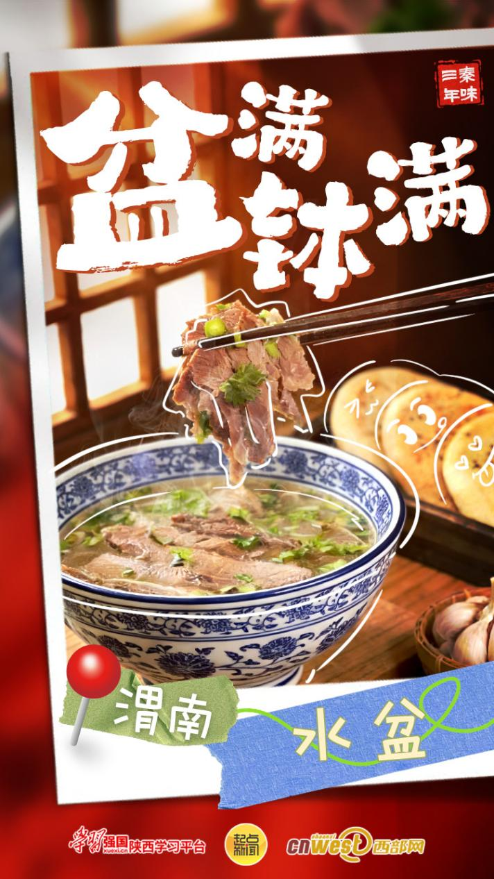 水盆以渭南澄城、蒲城、大荔三县最为著称。2016年,澄城水盆羊肉制作技艺被列入陕西省非物质文化遗产名录。其历史悠久,雏形可能与古代羊肉烹煮方式有关,因丝绸之路发扬光大。水盆因其丰盛、鲜美、滋补的特点以及承载的深厚情感,成为渭南地区人们过年的重要美食之一,既可以作为春节家庭聚餐的一道硬菜,也是招待返乡亲友、体验地道家乡味的首选。