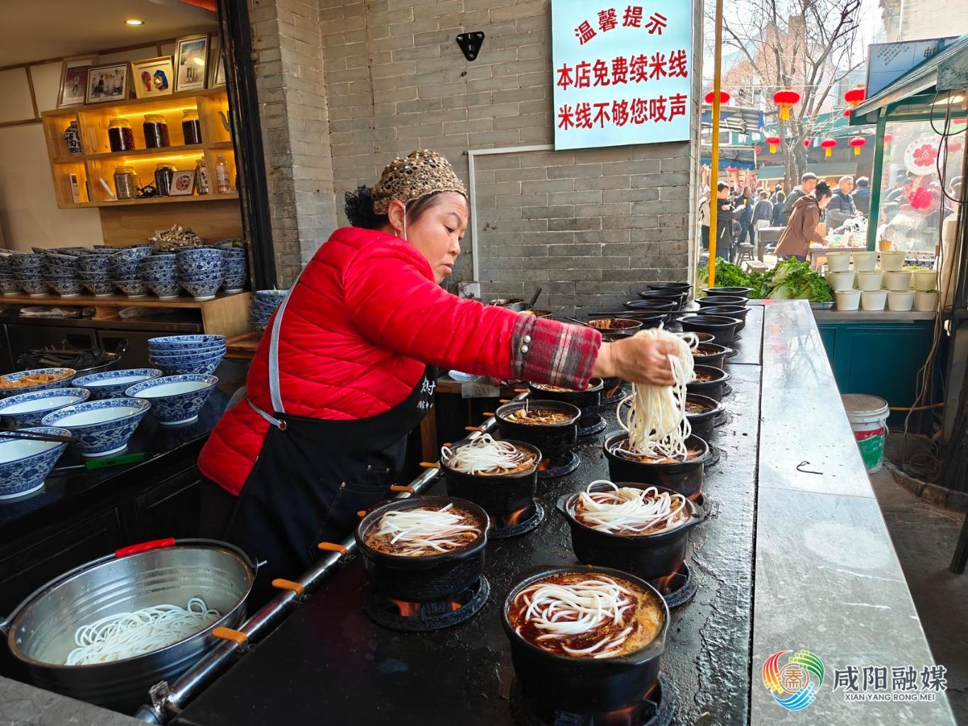 与香酥泡油糕同在回民街的老杨家麻辣米线门前排起了长队,浓郁的麻辣鲜香味道在街巷里飘散,引得游客驻足等候。