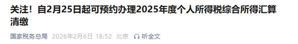 国家税务总局关于2025年度个人所得税综合所得汇算清缴预约办理时间的通告