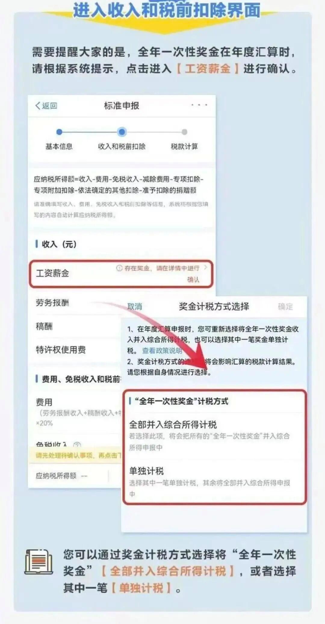 对职场人而言,一般是工资收入大于年终奖收入,可选择单独计税,这样适用比并入综合所得较低的税率档。当然可以直接两种方式各选一次,哪种退税多或补税少就选哪种。