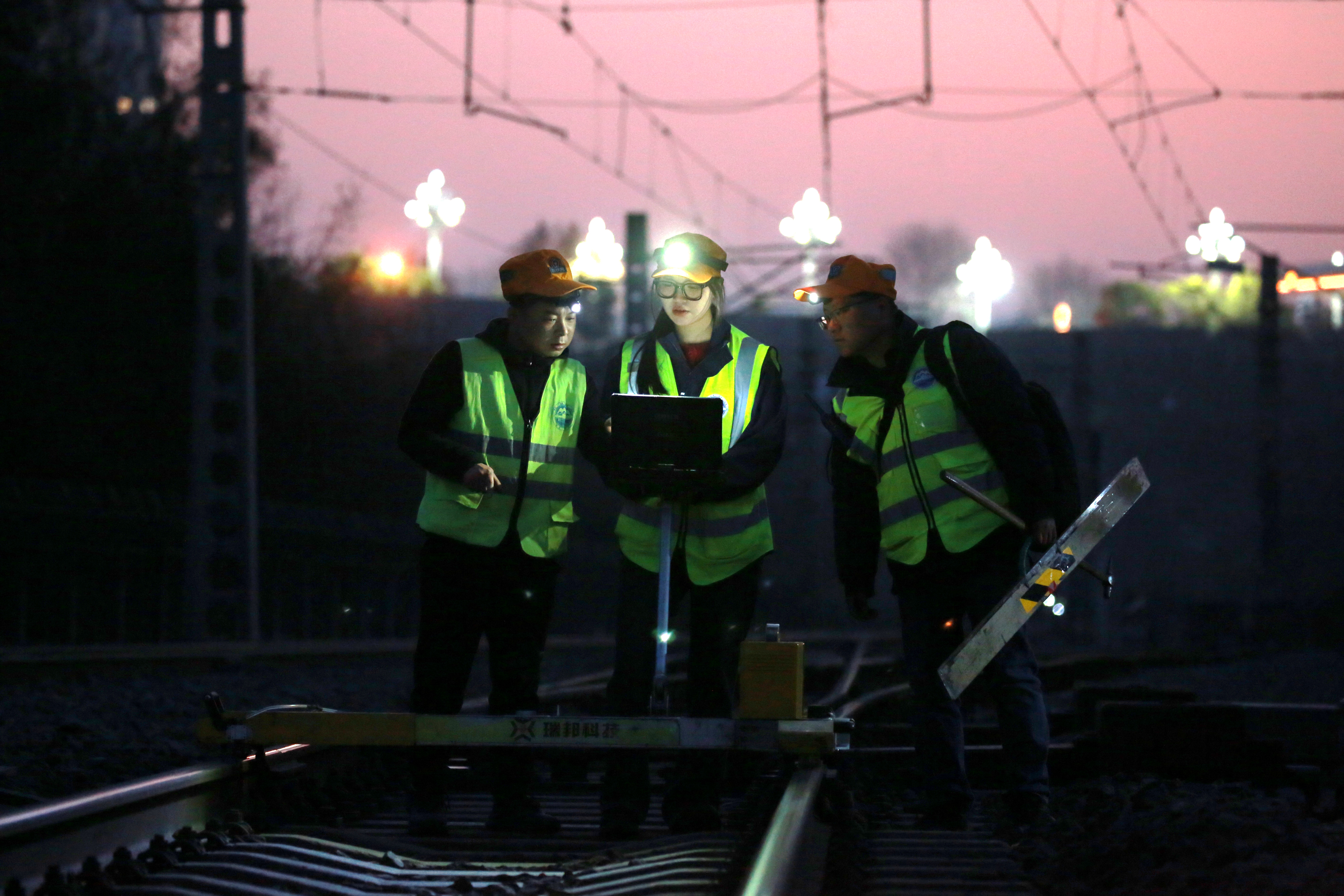 晚上8点半,作业结束。姚媛和工友们收拾工具,沿检修梯稳步走下。不远处,一列客车亮着温暖的车窗,从他们刚检查过的轨道上平稳驶过。