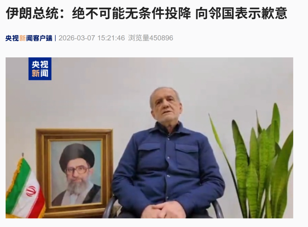 记者获悉,当地时间3月7日,伊朗总统佩泽希齐扬发表讲话,号召全民团结守卫伊朗,并表示伊朗绝不可能无条件投降。