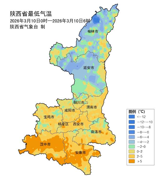 昨日受西北气流影响,全省天气晴朗,日最高气温10~23℃,最高旬阳22.5℃,西安站13.8℃;日最高气温较前一日上升1~10℃,最大升幅为蓝田10.1℃。今晨(截至06时)陕北部分、关中北部局地、秦巴山区局地共572监测站最低气温低于0℃,全省最低气温分布:陕北-12~4℃,最低神木圪丑沟站-12.3℃;关中-4~8℃,最低旬邑马栏金盆站-4.5℃,西安站4.5℃;陕南-3~11℃,最低平利天书峡站-2.8℃(图1)。昨夜至今晨,泾阳、黄陵、彬州、洛川、富县出现特强浓雾到浓雾,千阳、咸阳、周至、岐山、蓝田、华州等地出现大雾。昨日至今晨华山、太白2站出现大风,最高华山站22.2米/秒(9级)。