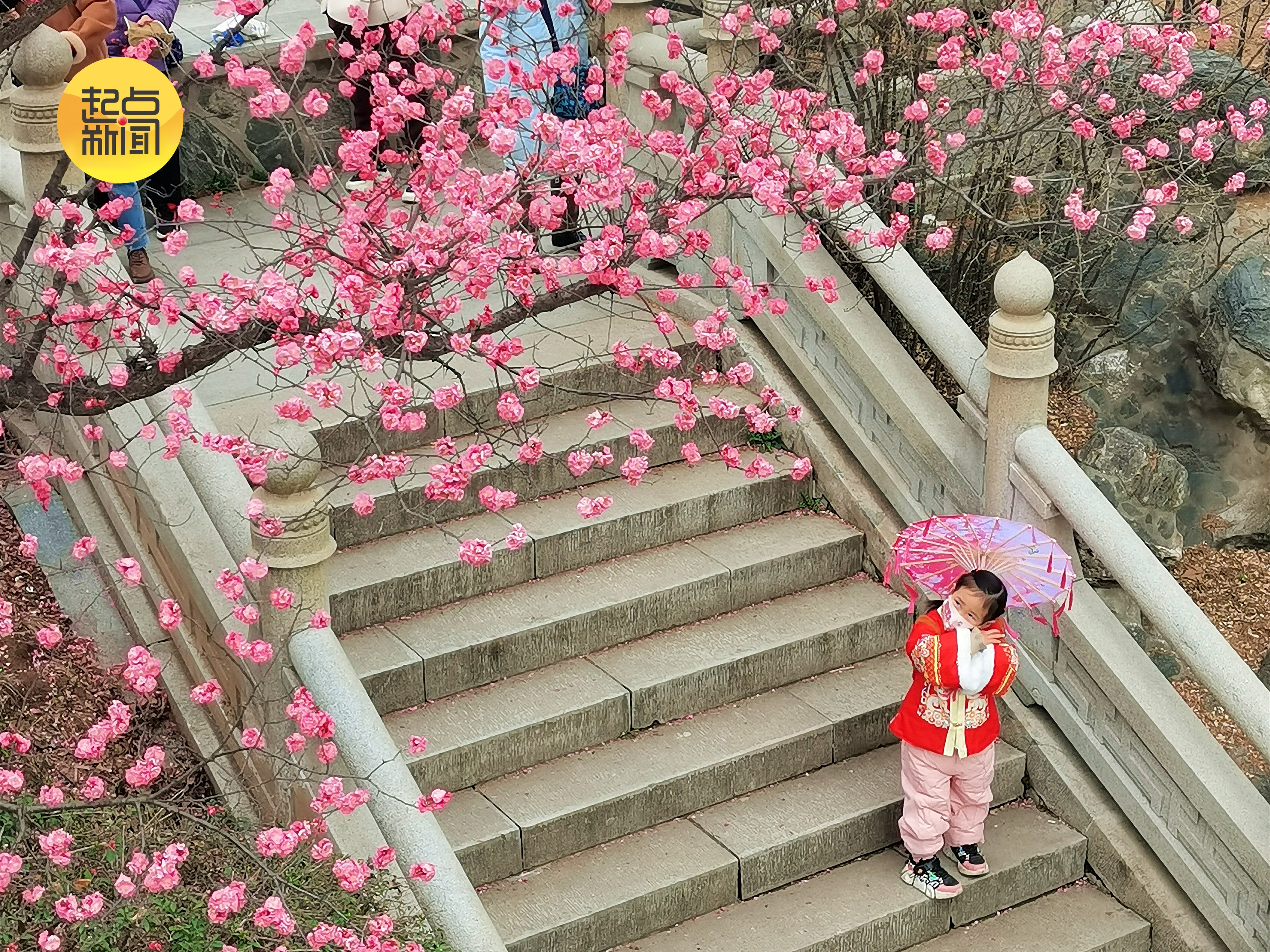花开时节,一个小姑娘在西安兴庆宫公园,欣赏梅花的绽放,人萌花美。