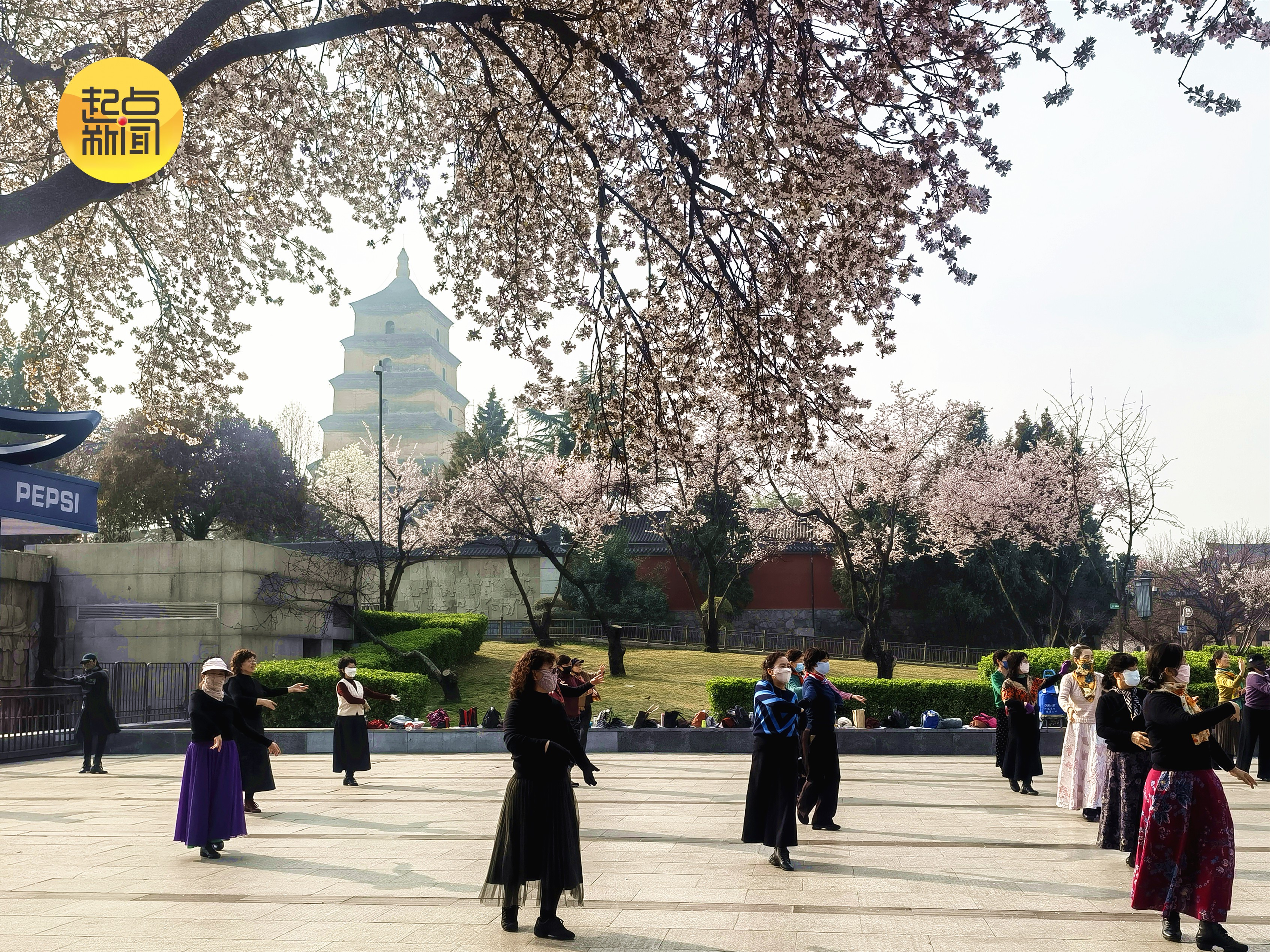 在西安大雁塔北广场,市民们跳着舞感受着春天的暖意,陶醉在悠扬的舞曲之中。