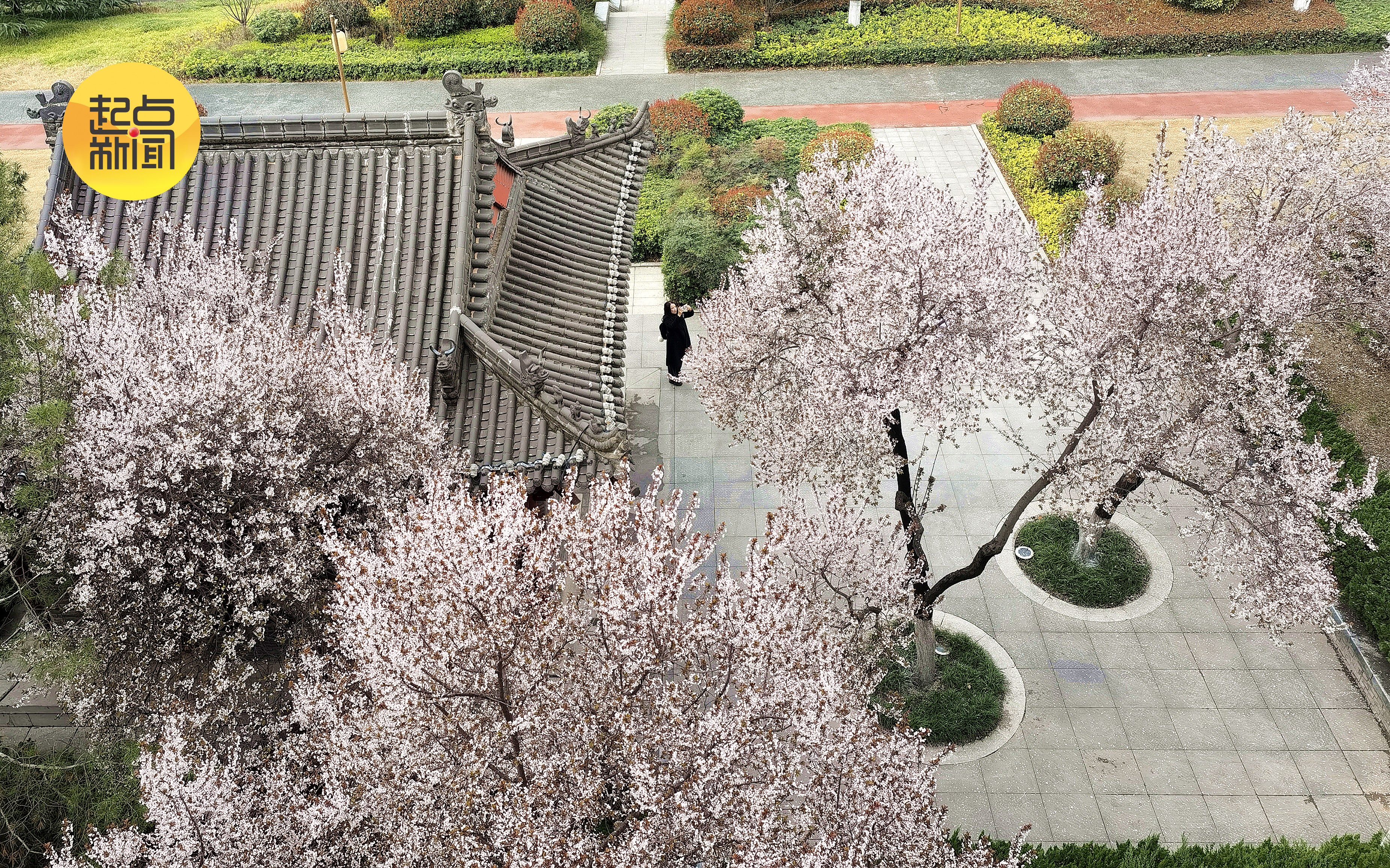 城墙上俯视环城公园、公园内紫叶李竞相绽放,朵朵小花点缀着公园内各个角落,正是市民拍照打卡的好去处。