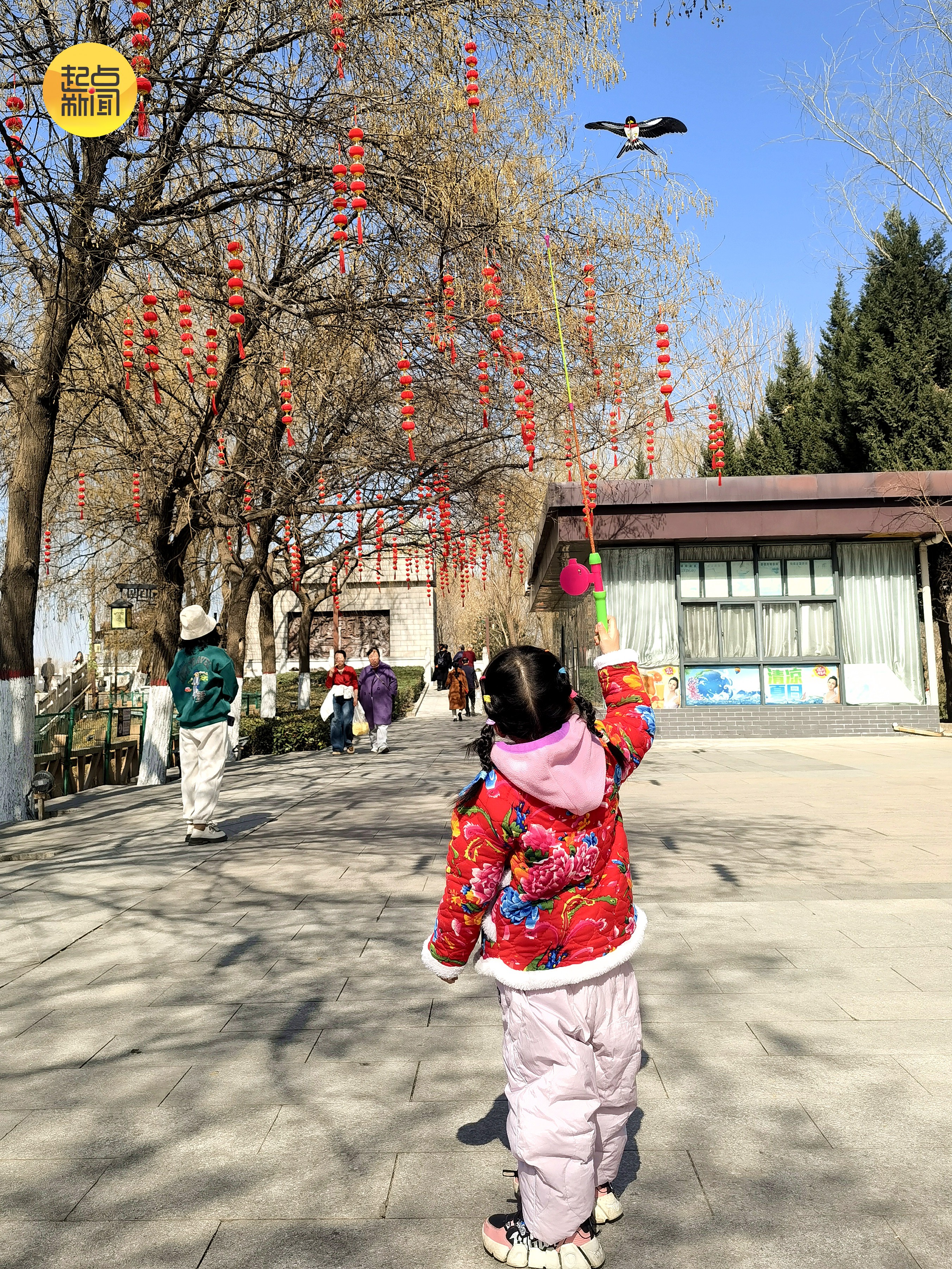 西安汉城湖,早春时节,树枝长满了柳芽。一位小女孩放着小燕子风筝,期盼小燕子归来期盼着春暖花开早点到来。
