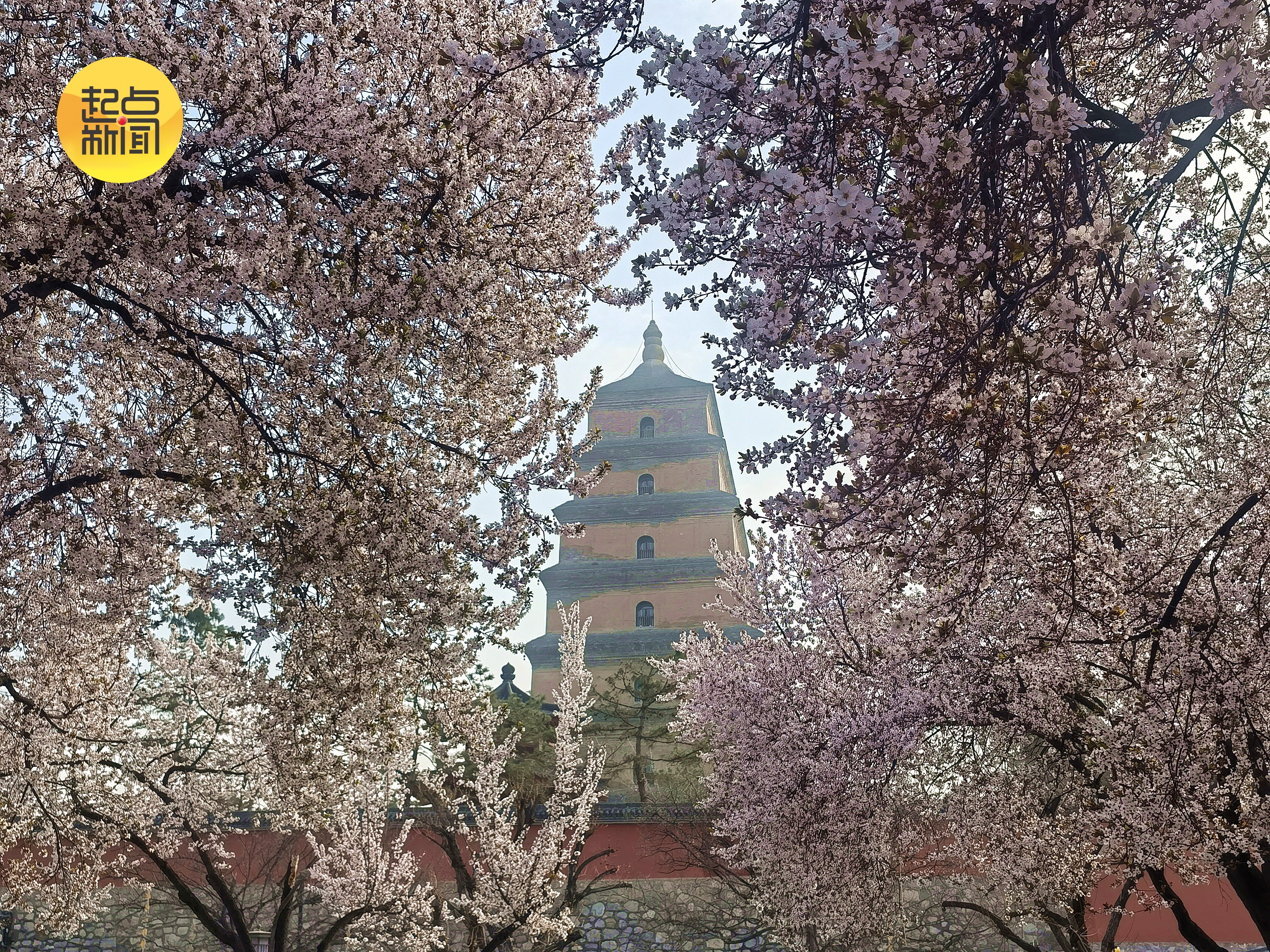 春暖花开桃花、梅花、紫叶李群芳争艳将大雁塔打扮的格外美丽。