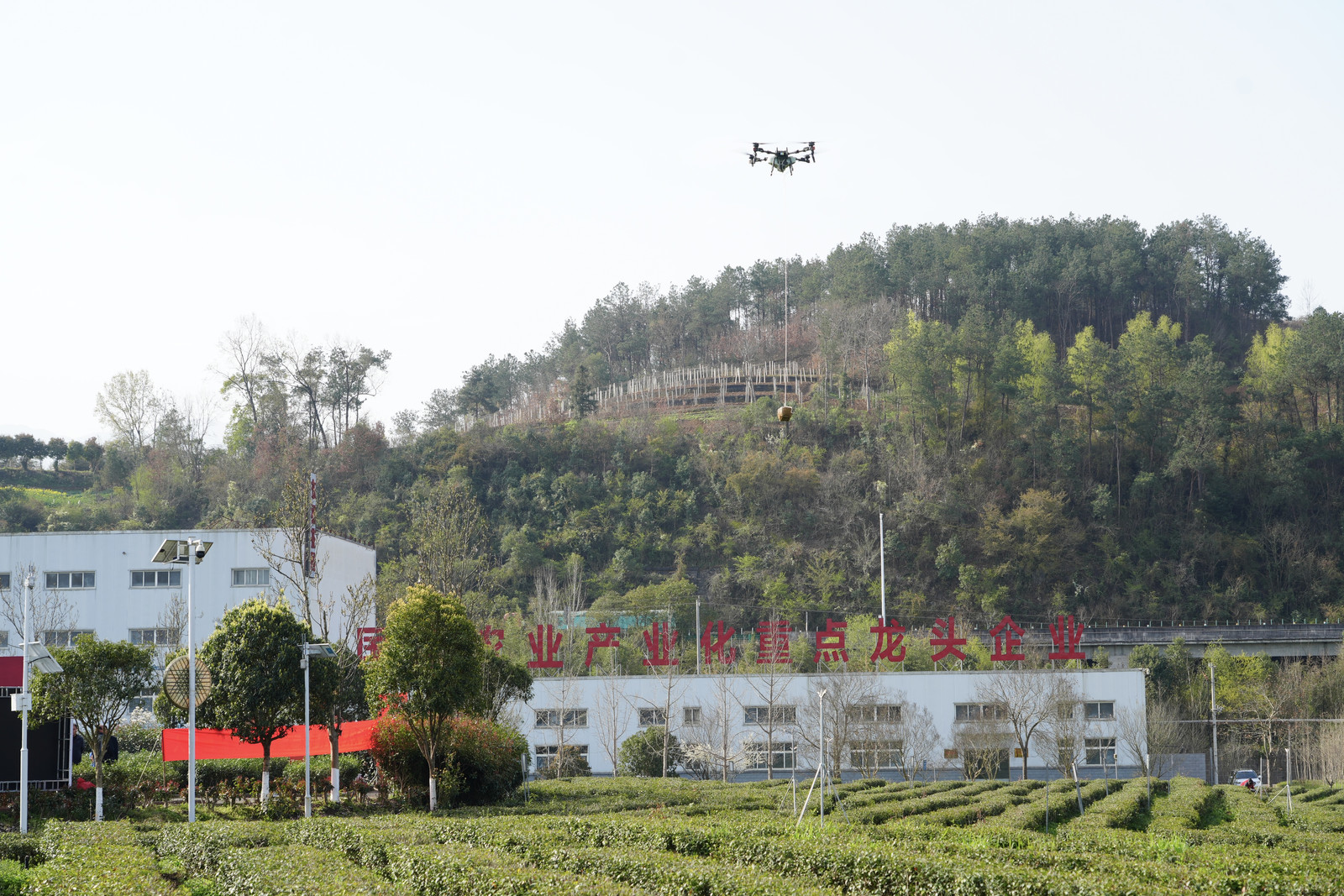 本次开采节,东裕茗茶创新性引入无人机鲜叶运输,改写了这一传统流程。活动现场,伴随着阵阵轰鸣声,一架无人机满载着刚采摘的汉中仙毫鲜叶,穿梭在绿意盎然的茶园上空,沿着既定航线平稳飞向舞台区域,全程高效、平稳、无损,短短数分钟便完成了鲜叶从采摘区到加工区的转运。