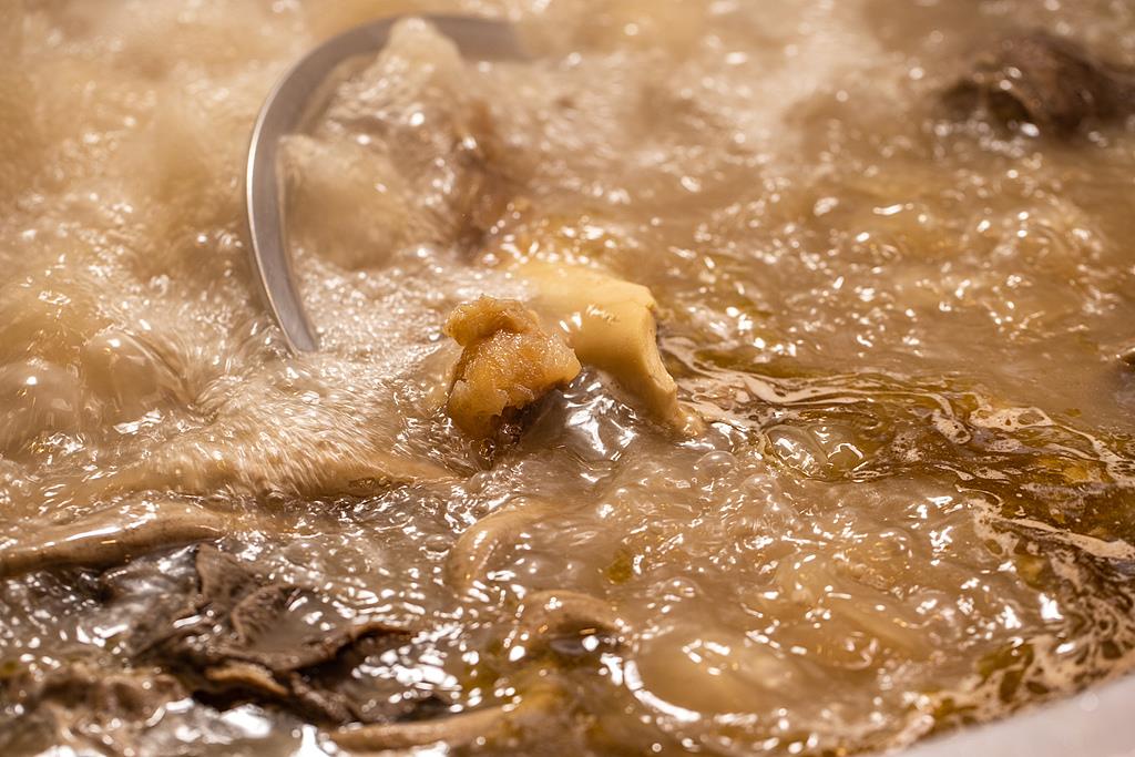 第二阶段的浮沫通常是白色,主要是肉中溶出的少量蛋白质在高温下变性凝集,还有一些脂肪。这种浮沫没有太多异味,但会让肉汤不够清澈养眼。随着熬煮时间变长,这种浮沫会因蛋白质的进一步水解而消失。如果介意,可以去除。