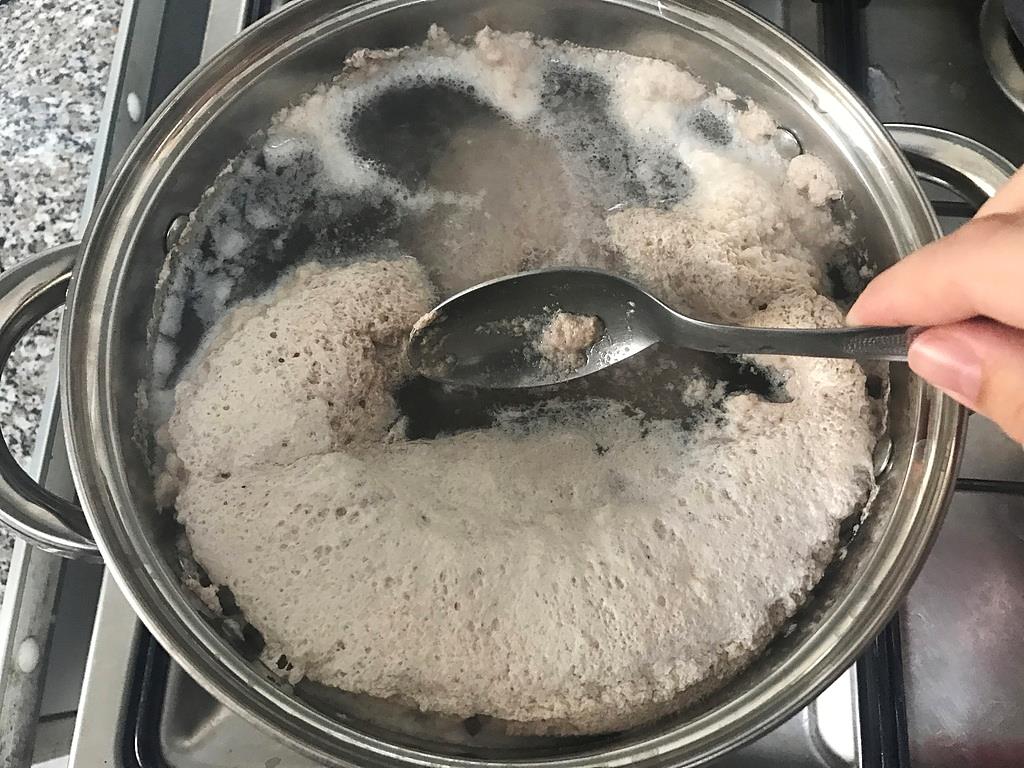 炖煮肉汤时出现浮沫通常分为两个主要阶段,第一阶段的浮沫为褐色、红棕色,主要是肉中渗出的血液、一些脂肪、少量溶解的蛋白质和其他杂质凝结在一起形成的。这种浮沫有较强的腥膻味,影响肉汤颜值和风味,应及时撇去。