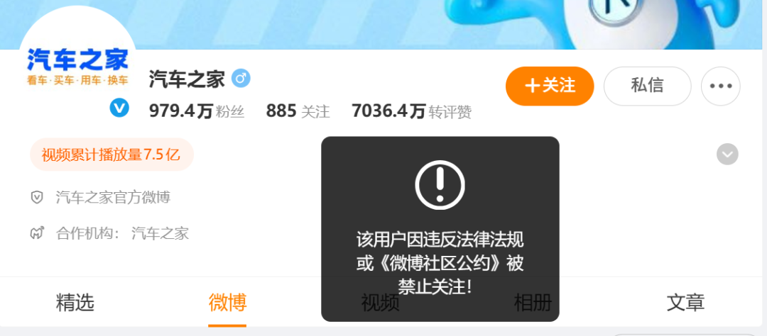 “汽车之家”多个账号被禁止关注。