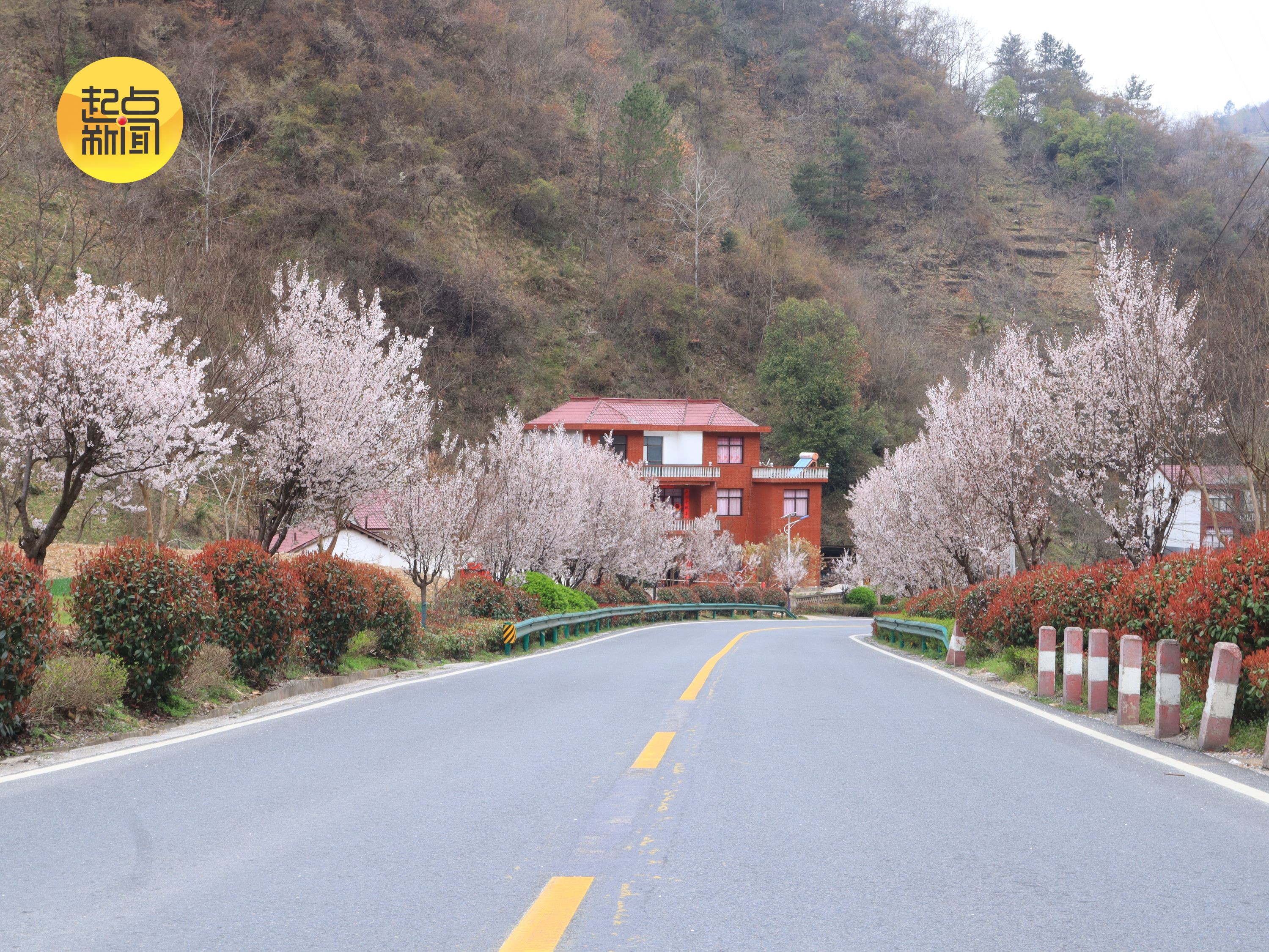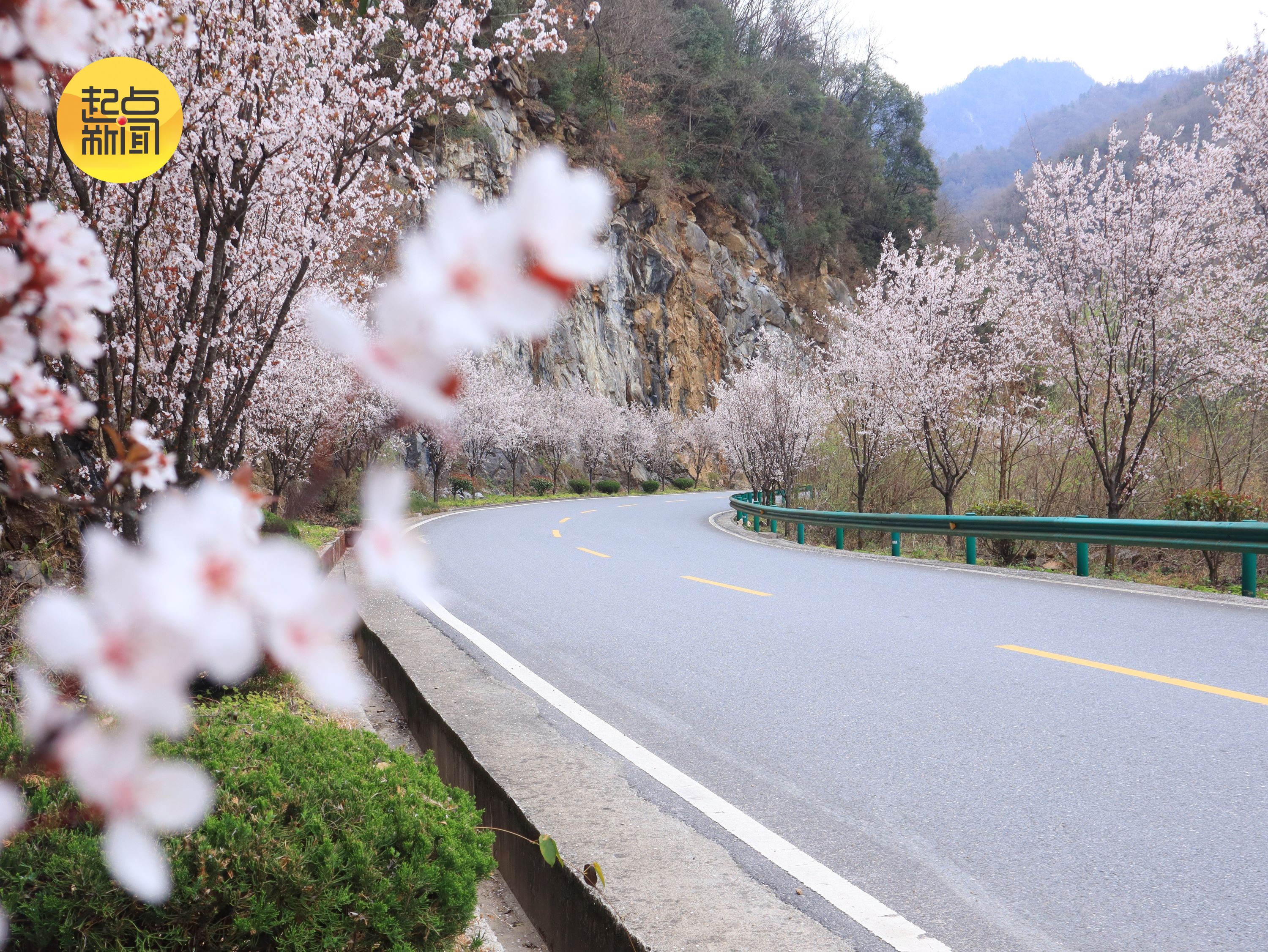 国道蜿蜒向前,繁花次第绽放,青山绿水相映,绘就春日最美画卷。