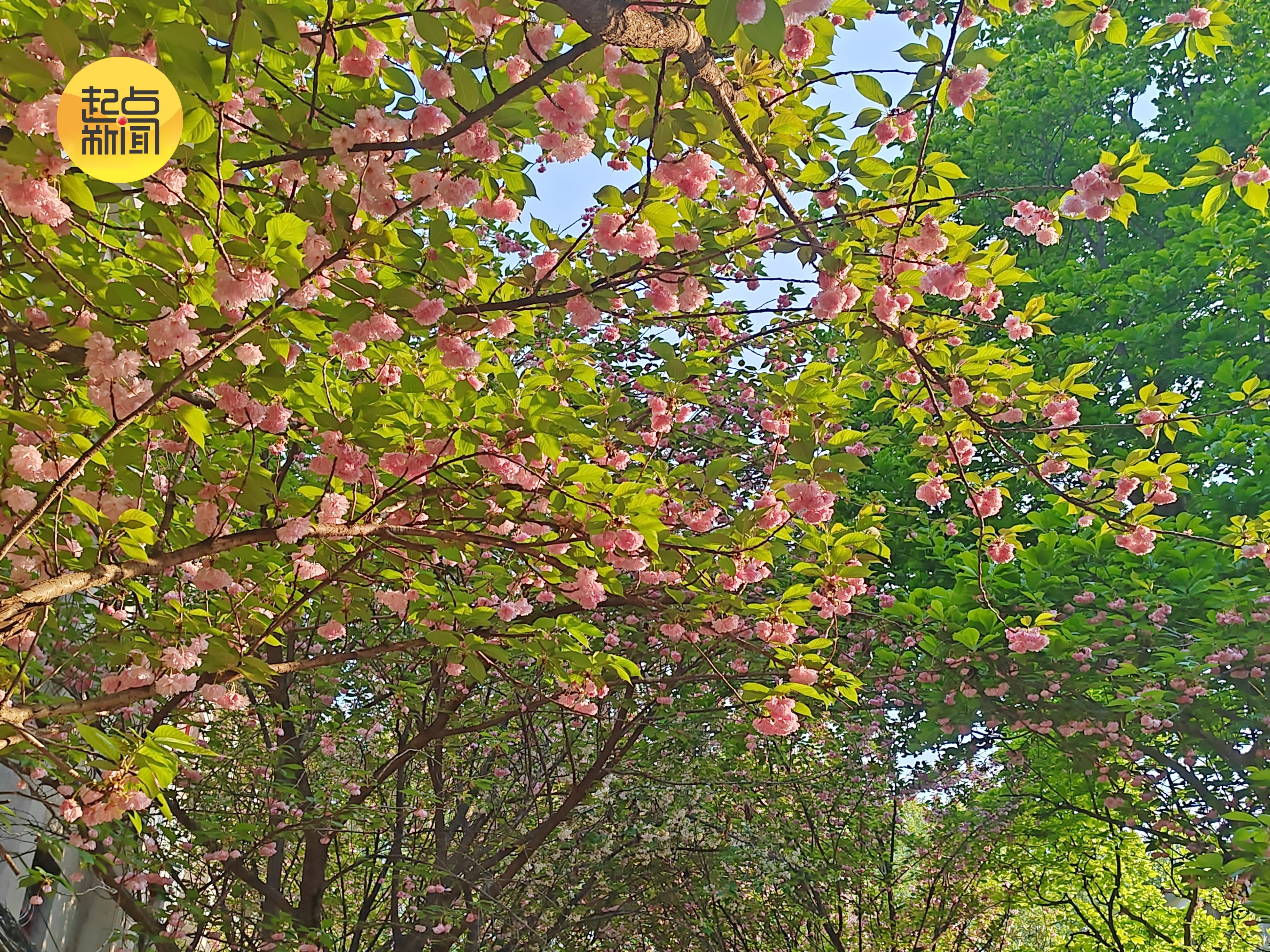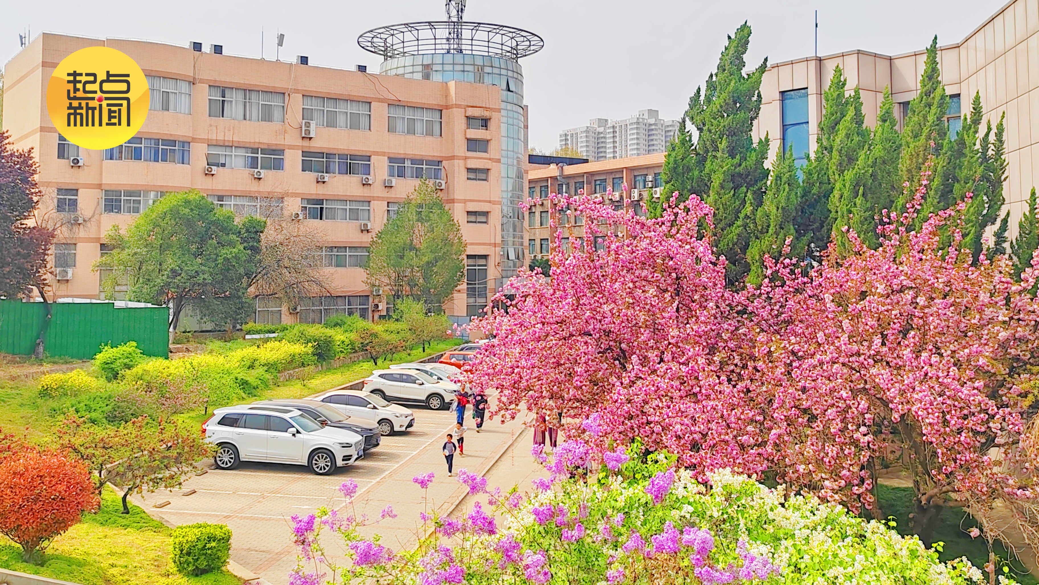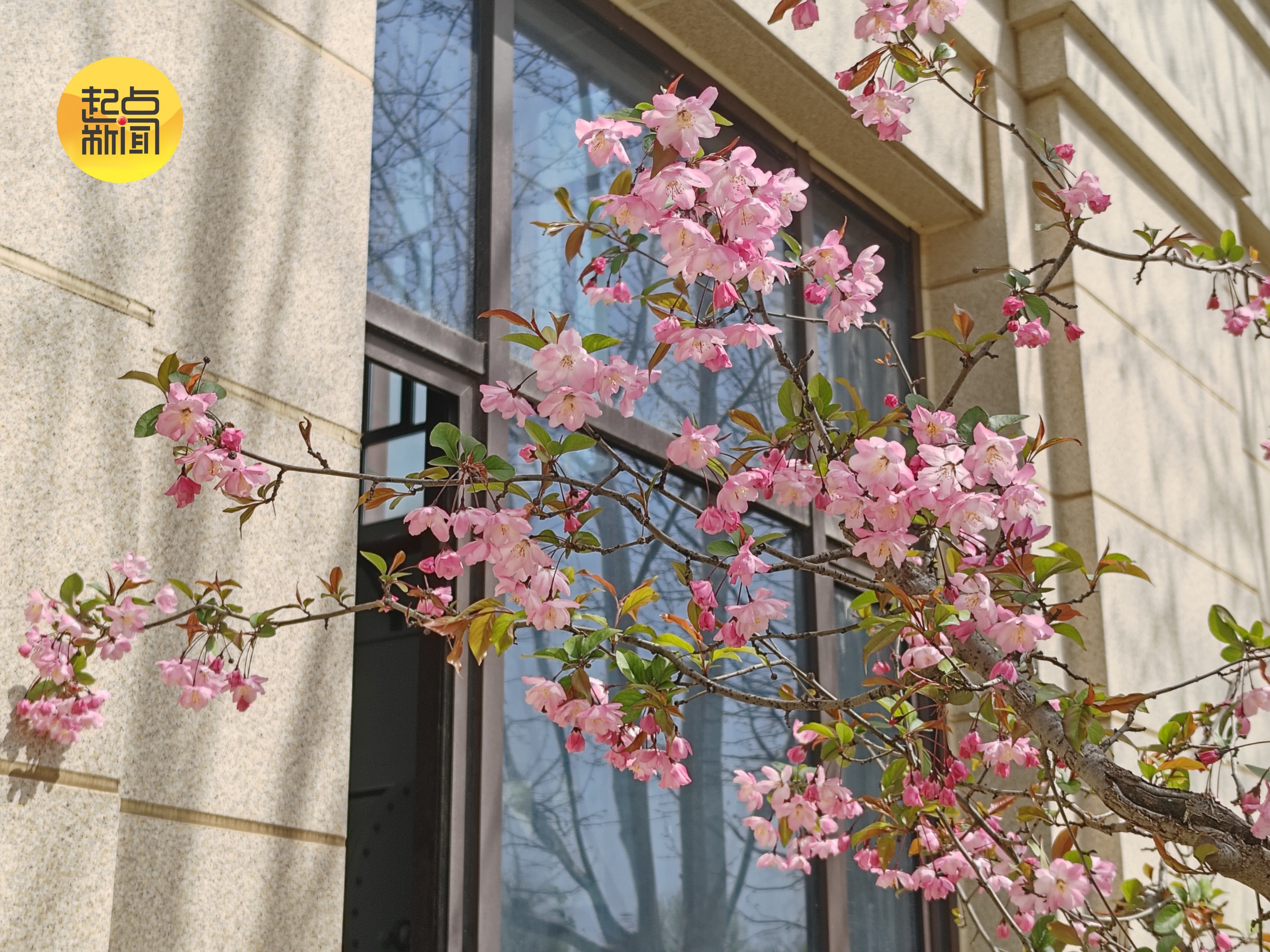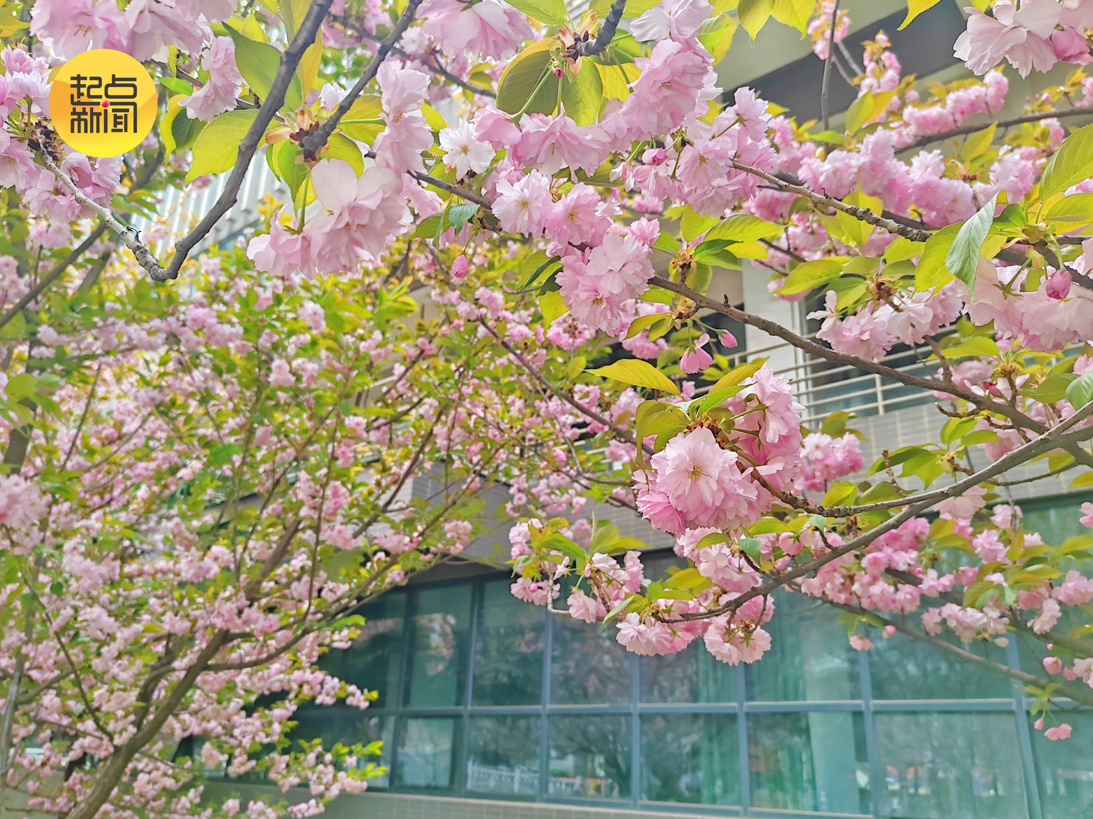 楼宇旁繁花映春添无限亮色,粉白交织热烈绽放,与建筑线条相融,尽显春日的鲜活与热烈。