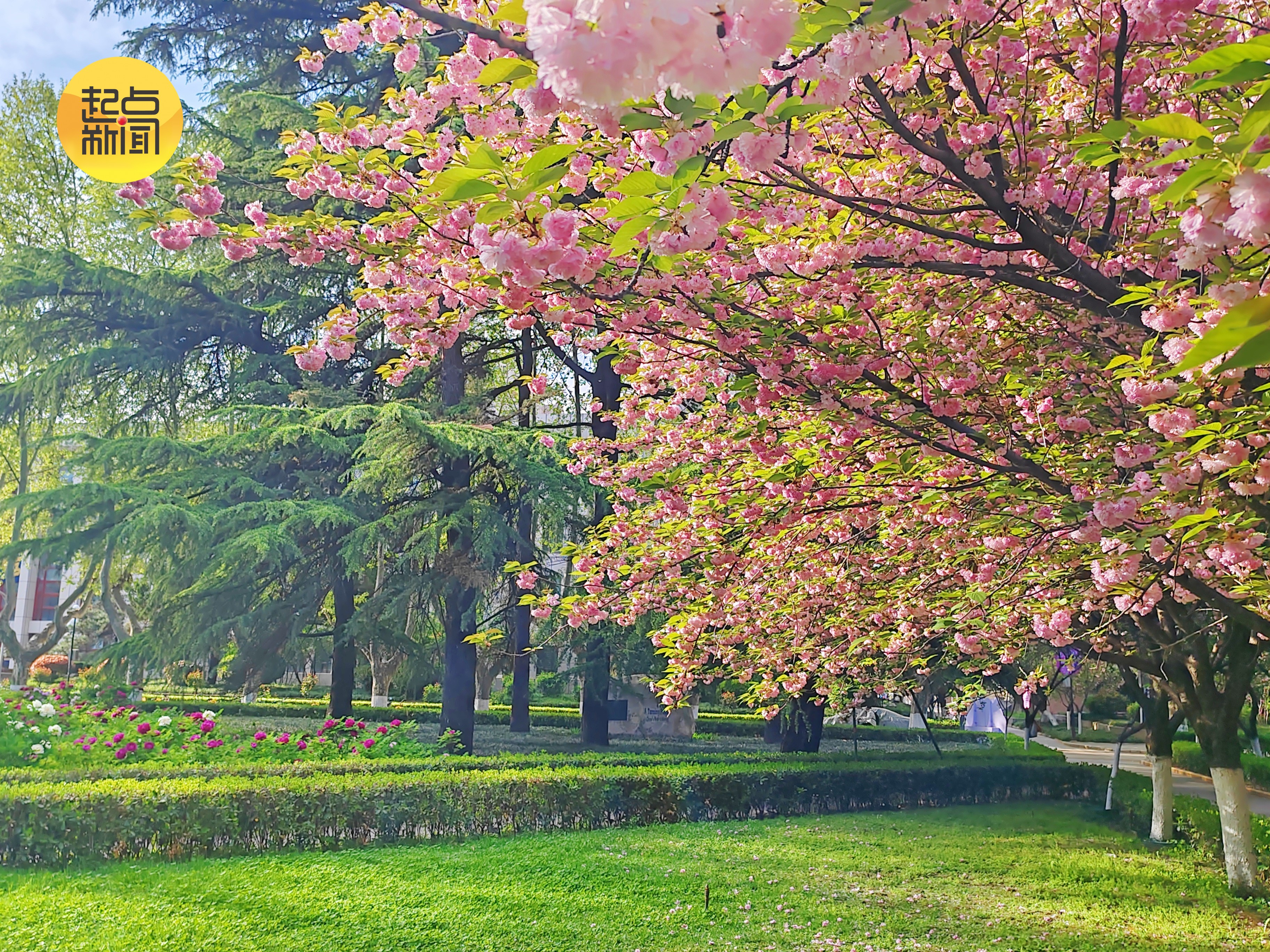 繁花织就春日锦绣画卷,粉瓣叠翠绿意相衬,与松柏相伴生长,铺展满目春日风光,尽显自然的巧思与浪漫。