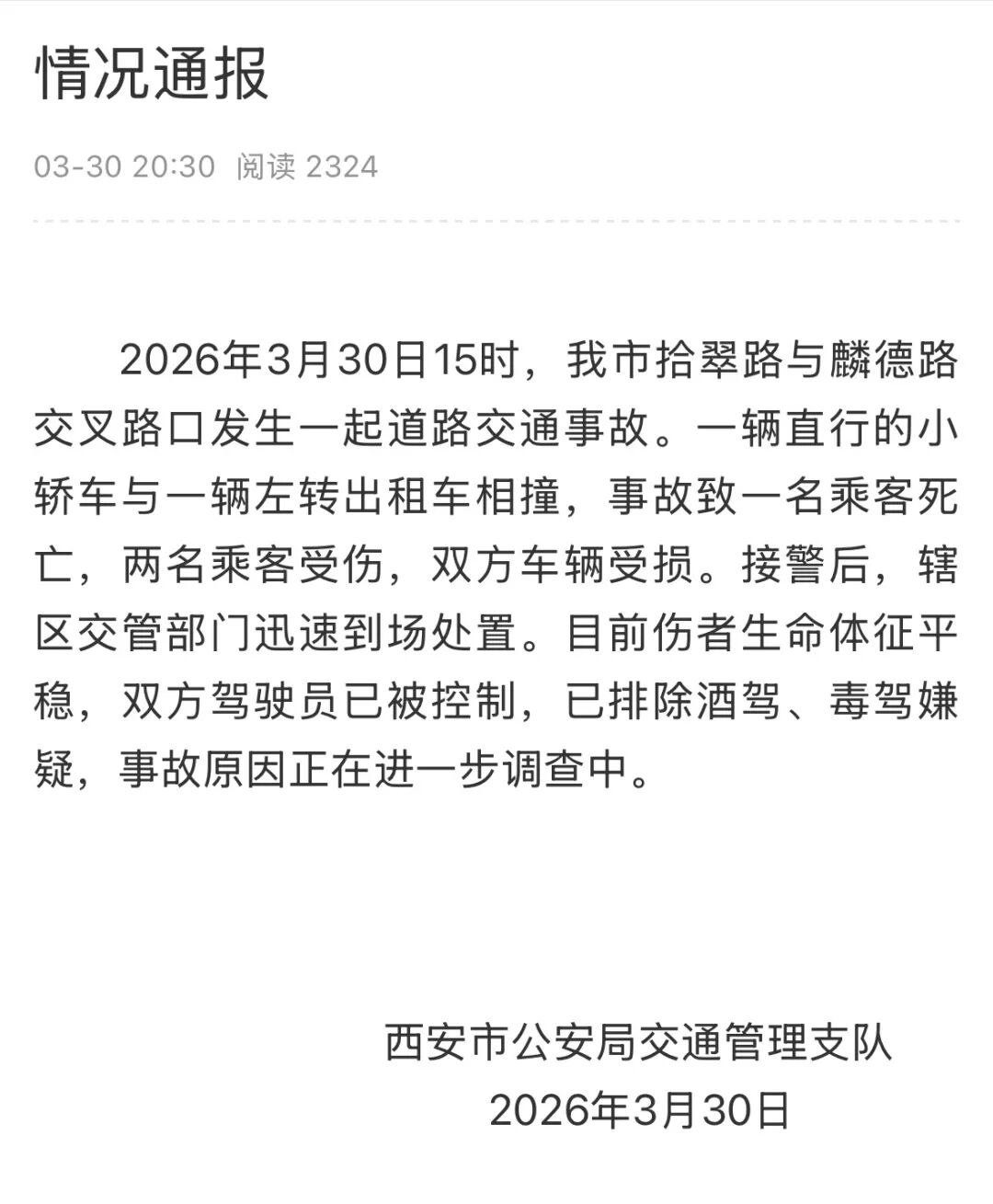 2026年3月30日15时,西安市拾翠路与麟德路交叉路口发生一起道路交通事故。一辆直行的小轿车与一辆左转出租车相撞,事故致一名乘客死亡,两名乘客受伤,双方车辆受损。接警后,辖区交管部门迅速到场处置。目前伤者生命体征平稳,双方驾驶员已被控制,已排除酒驾、毒驾嫌疑,事故原因正在进一步调查中。