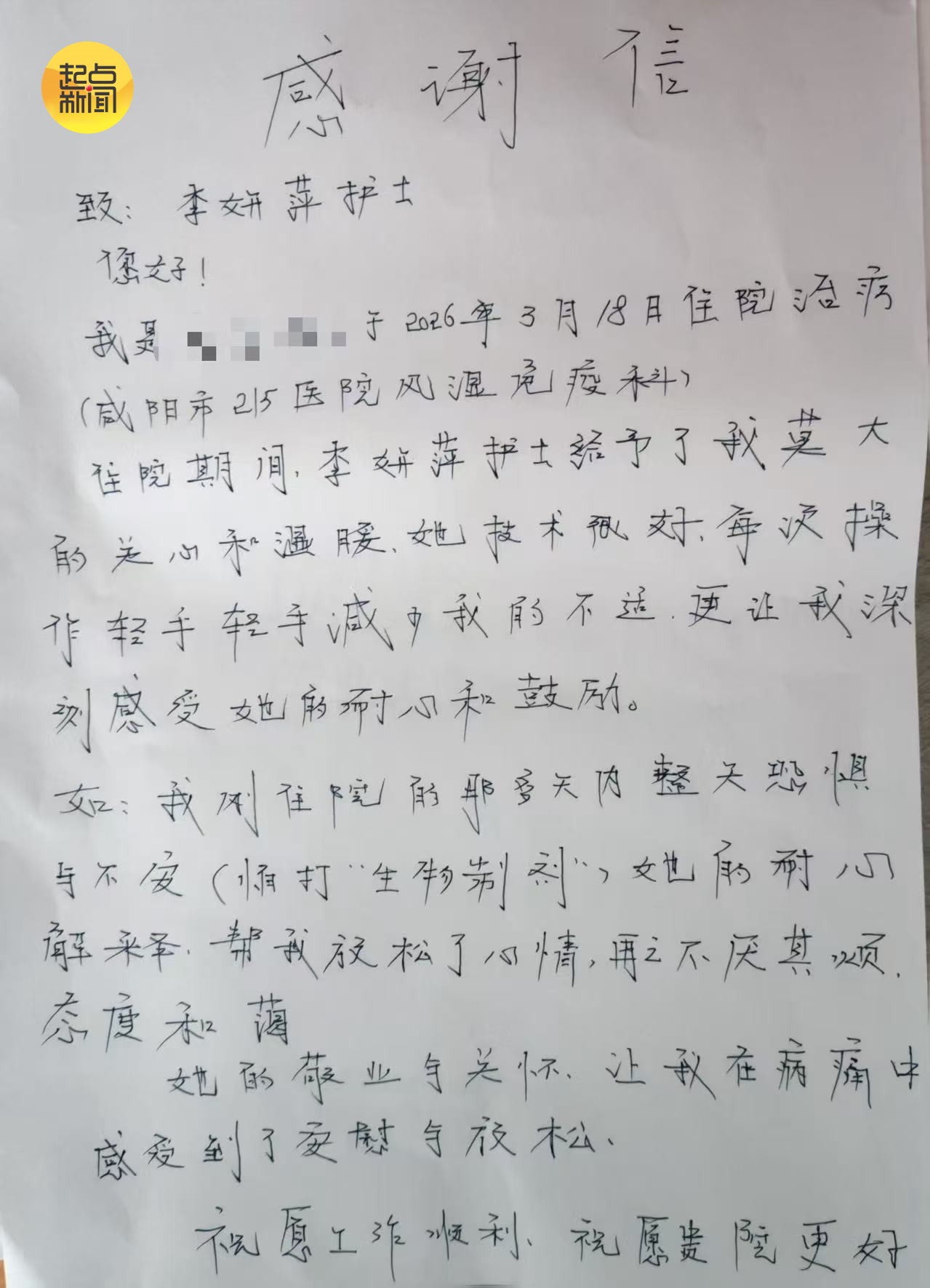 出院前,她趴在病床上,握着笔,慢慢地写下了一封感谢信,把这些日子里李妍萍护士对她的照顾与陪伴,都写进了字里行间。
