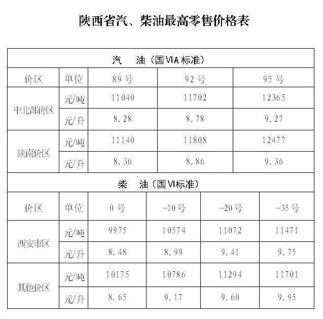 陕西省成品油价格调整通告