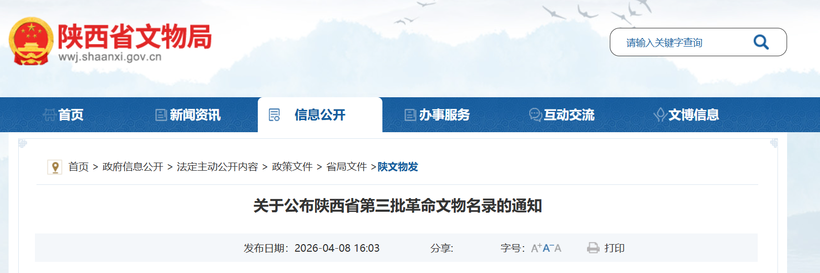 4月8日,陕西省文物局发布关于公布陕西省第三批革命文物名录的通知,这批公布的名录包括不可移动革命文物93处、可移动革命文物1392件。