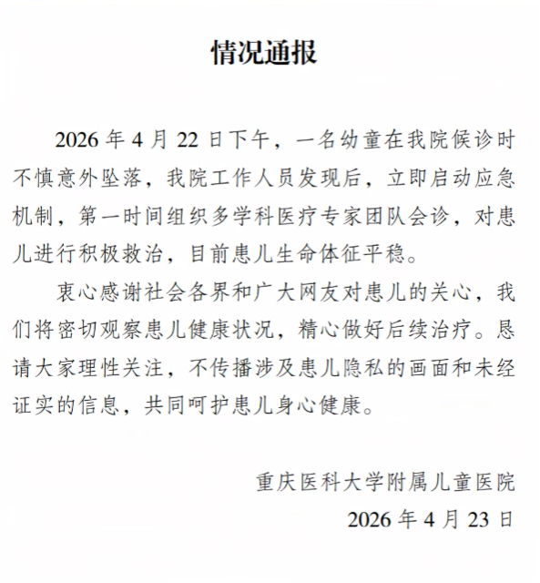 4月23日,重庆医科大学附属儿童医院发布情况通报: